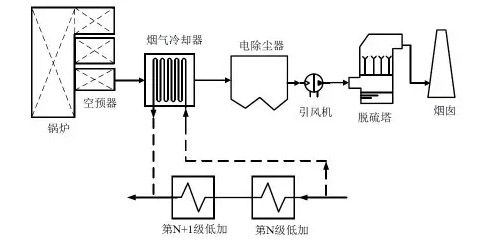 在凝結(jié)水方面,從N級(jí)低壓加熱器入口抽取一部分凝結(jié)水,進(jìn)入煙氣冷卻器后被加熱,返回至N+1級(jí)(按實(shí)際情況而定)低壓加熱器出口,從而節(jié)省低壓加熱器的抽汽,增加汽輪機(jī)的做功,節(jié)省煤耗。